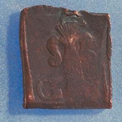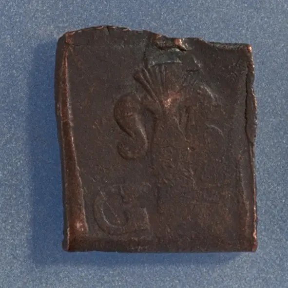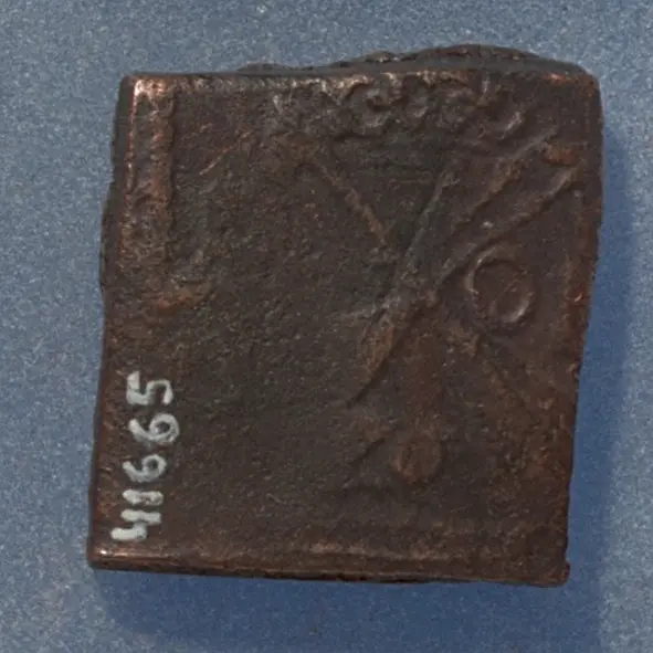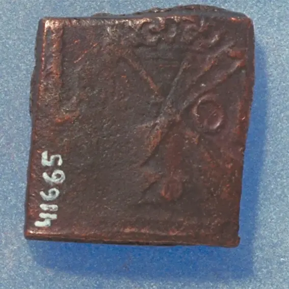 Frånsidan: två korsade pilar under en krona, svagt synliga.
