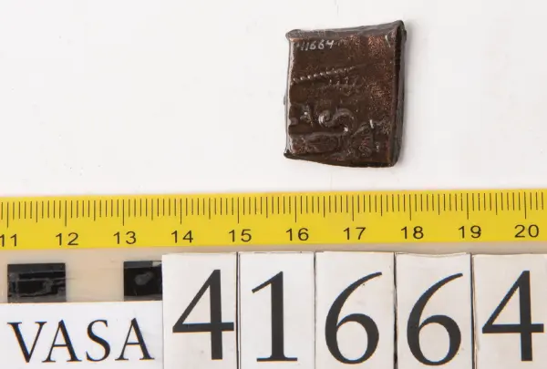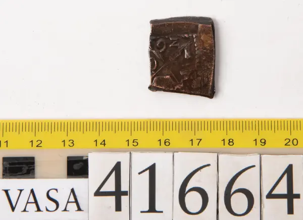 Text in English: Square-shaped coin. Denomination: ½ - öre.