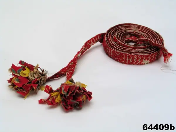 b: Mönstervävt band, "krusband", med tofsar, "tuppor" i en änden. Varp: rött ullgarn och oblekt lingarn med grön mittbård. Inslag: oblekt lingarn. Bandet har varierande mönsterformer avdelade med stolpar. I ena änden har varpen delats och avslutats med två styck fyra cm långa tofsar av tygremsor i bl a kattun och siden. Den andra änden saknar tofs.