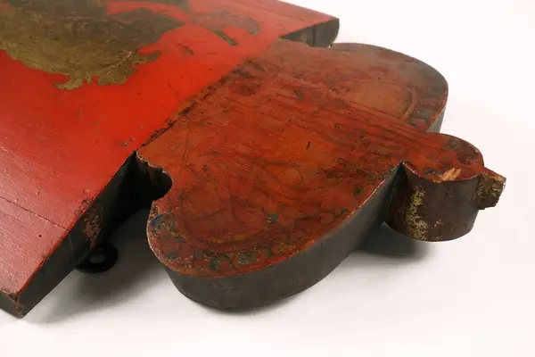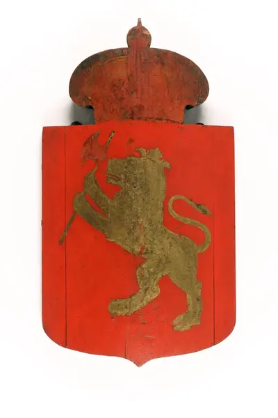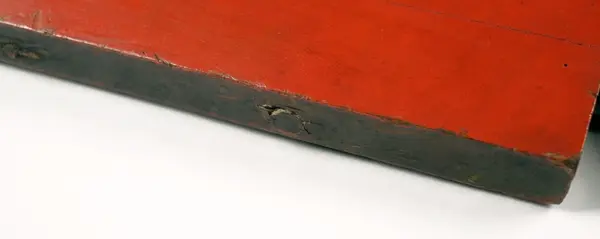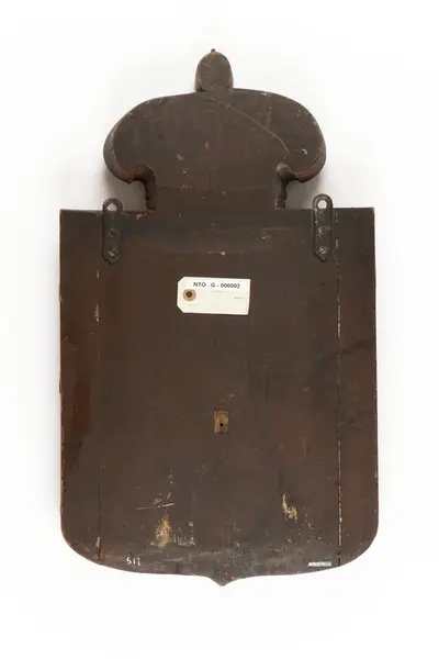 - Tilsynelatende er dagens motiv sekundært. Trolig er den bleke, slitte rødfargen på kronen en del av den originale bemalingen, mens den røde bakgrunnen med riksvåpenet er sekundært. Dette antas på bakgrunn av at øverste lag maling er påført i et lag over rødfargen på kronen. Den antatt sekundære malingen kan også ses i skader i treverket, hvilket også antyder at underlaget har vært brukt tidligere.