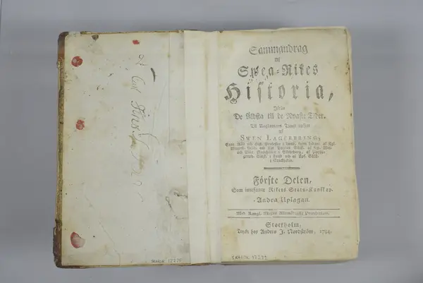 - Bok, skriven av Swen Lagerbring, tryckt 1784 hos Anders J. Nordström, Stockholm. Gåva av Nordiska museets och Skansens vänner 1938, inköpt hos antikvariat Björck & Börjesson, Stockholm. Har ingått i Johan Gabriel Sacks bibliotek på Bergshammar.