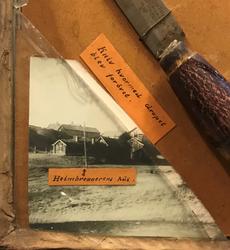 Montasje med foto og bevismateriale fra drapet på Røros 1934. Kniven er merket 321/34, som antas å være saksnummeret.