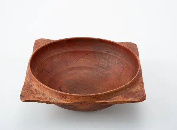 Svarvad låg skål med fyra utskjutande "snibbar" nedanför den runda mynningen. De sitter placerade i en fyrkant.