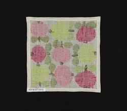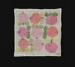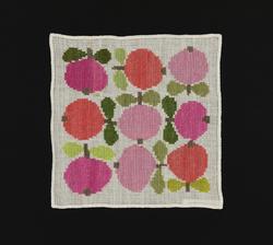 Duken är broderad med mönster designat av Raine Navin, 1968, för Södra Kalmar Läns Hemslöjdsförening.