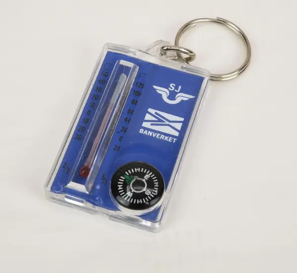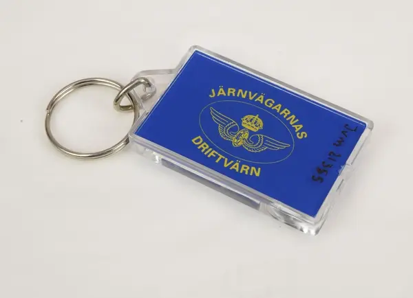 Nyckelringen är en så kallad 'giveaway' som delades ut för att göra reklam eller informera. Den har logotyper från SJ, Banverket och Järnvägarnas Driftvärn.