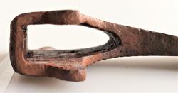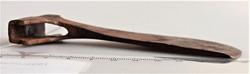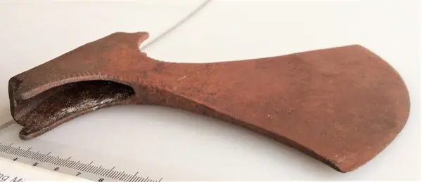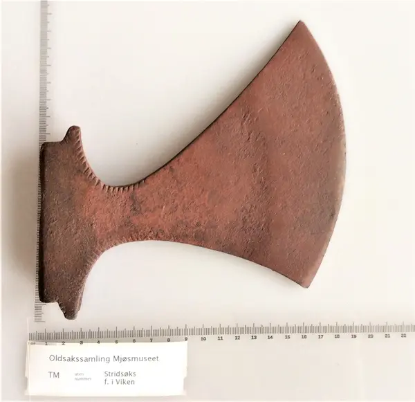 1 Stridsøxe af Jærn fundet for mange Aar siden i en Steenrøs i Vigen – Balke Anex mig foræret af Mads Wang den 27d August 1884. 26/7 86 Profæssor Rygh antager at Øxen skriver sig fra 17d Aarhundrede og efter Æggen at dømme have havt krumt Skaft.