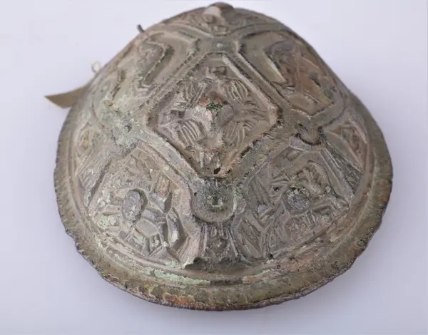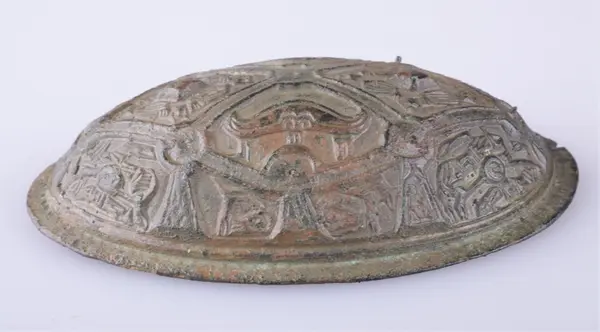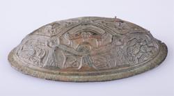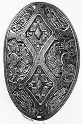 87. Oval bronsespænde, variant av R. 647 10.4 cm. l., største bredde 6.6 cm. Fundet i en haug paa Traaset i Faaberg.