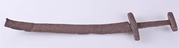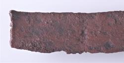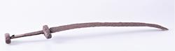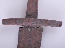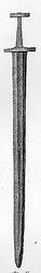 109. Enegget sverd av typen R. 489 hjaltene 8.1 og 13.6 cm. l. avsanden mellem dem 8.5 cm. Klingen avbrukket, bare 33 cm. l. bev. bredde 5.6 cm.