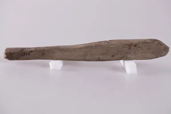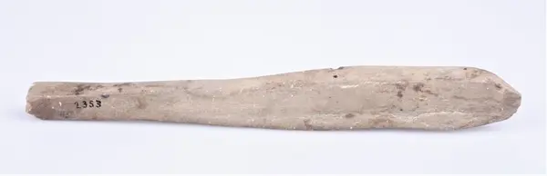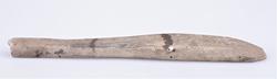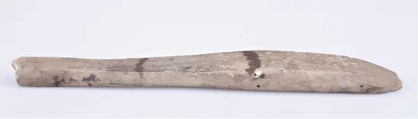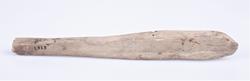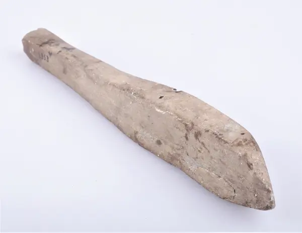 115. Skiferbryne 31 cm.l. sterkt slitt, fundet i en haug paa Vallejordet ved jernbaneanlegget antakelig i 1903.