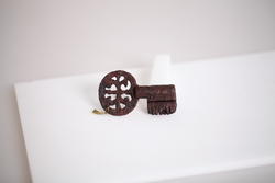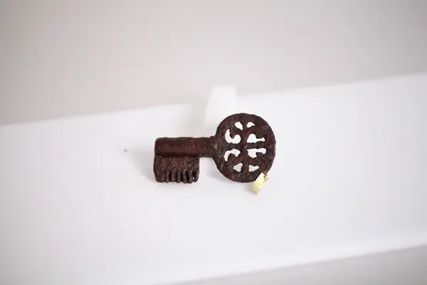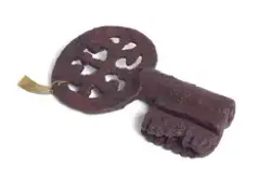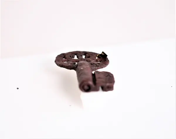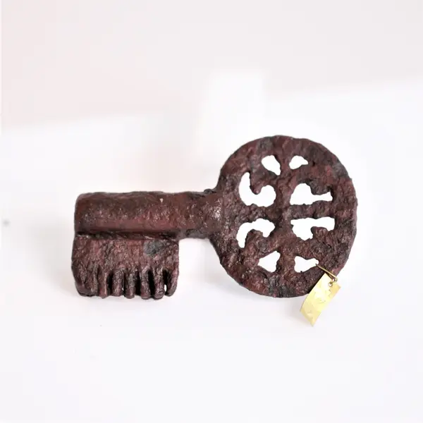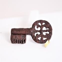 En Jærn - Nøgel fundet i en før udgravet Gravhaug paa Gaarden østre Krabye nogle hundrede Ah vestenfor Gaarden ved Smedien og mig foræret af Gaardbruger Peder Nielsen Krabye den 8/11 82. Profæssor Rygh opgav den at være fra den Katholske Tid, Middelalderen.