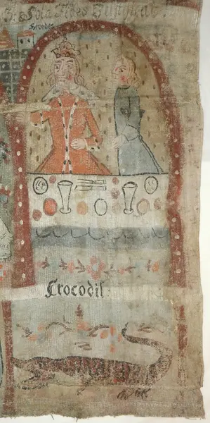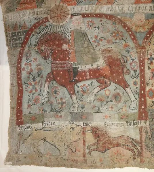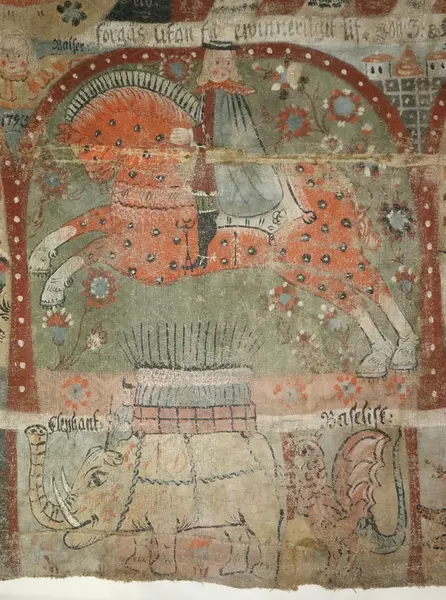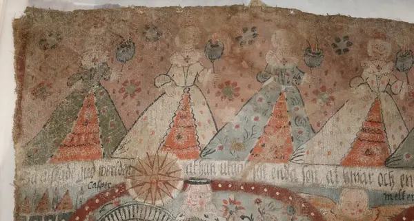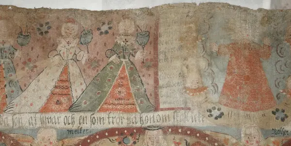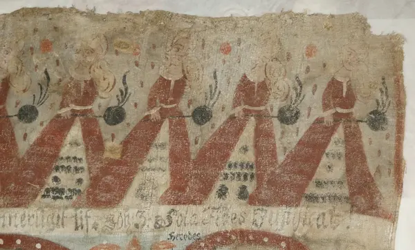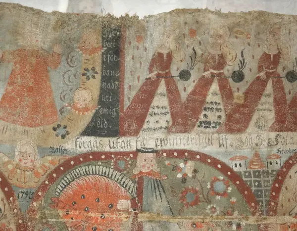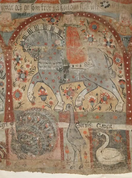 Jämför målning och textning med densamma på bonadsmålningen L 1478 vilken troligen har samma konstnär.