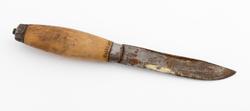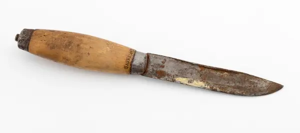 Kniven fikk jeg av Anton Arnestad, som var gardskar i Sagstugua, som var den største gården her i Mesnali. Han var på tømmerhogst i Åstdalen i mellomkrigstiden og under okkupasjonstiden, og etter denne tiden. Kniven har sunslått bladrygg, den har antakelig vært brukt til å kløyve vedstikker og til å fyre opp ovnen i koia.