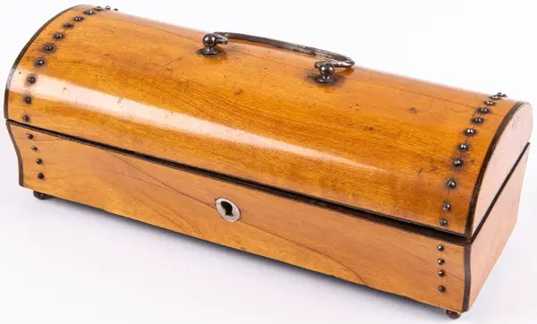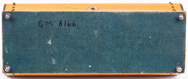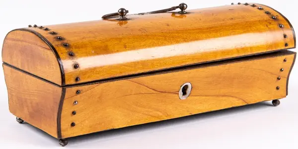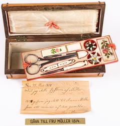 Innehåller ett meddelande att skrinet givits i gåva till Fru Möller 1814.