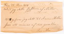 "Den 15 mars 1814 erhöl jag detta sÿskrin af Möller. 1874 gifver jag dett til Anna Möller som ett minna af den gamlla FarMor