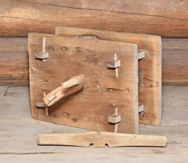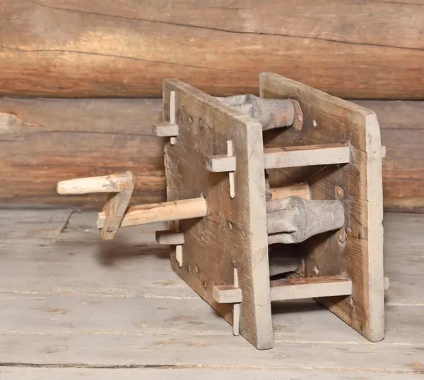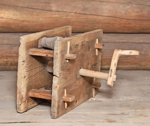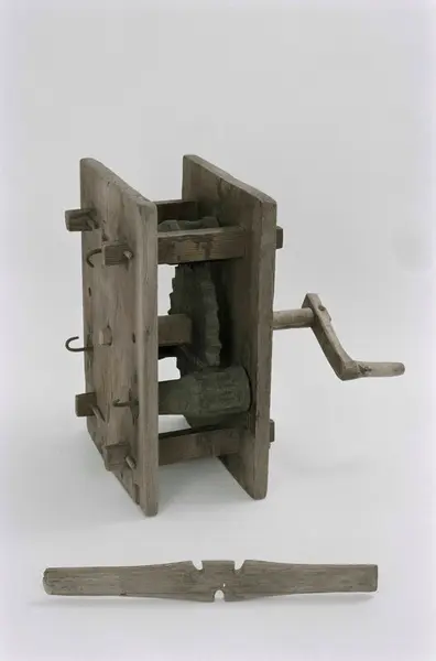 Geskär av trä, (A) tvinningsmaskin, för repslageri, med fäste för tre kardeler. Drivkonstruktion sammanfogad i två rektangulära plana plattor med fyra slåar. Inuti ett större kuggh...