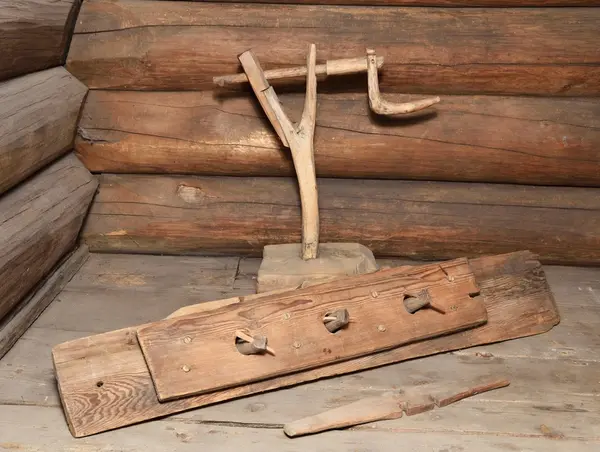 Tvinnmaskin av trä för repslageri. Bestående av tre delar. En repvagn för tre kardeler med tre stycken paralleldrivna trätvingar som framtill är fästa i en längre regel och baktill i ett konformat huvud,. Ändar på huvudet bildar handtag för vagnen. En stående vev av trä med y--formad ståndare i grövre fotplatta, ena bygeln är fö... Tvinnmaskin av trä för repslageri. Bestående av tre delar. En repvagn för tre kardeler med tre stycken paralleldrivna trätvingar som framtill är fästa i en längre regel och baktill i ett konformat huvud,. Ändar på huvudet bildar handtag för vagnen. En stående vev av trä med y--formad ståndare i grövre fotplatta, ena bygeln är förlängd med spikad träbit. Vevhandtag med en uppstående spik i andra ändan. Tillhörande konformad tvinnsticka med utsågade fästen.