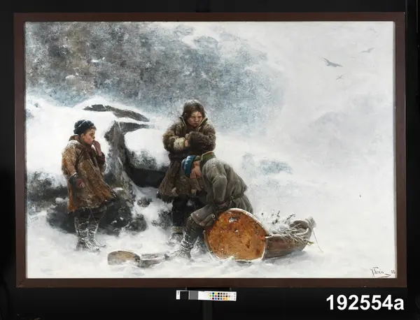 Oljemålningen är gjord av Johan Tirén (1853–1911). Även om målningen är gjord under en studieresa i Europa 1882 speglar den Tiréns stora intresse för den samiska kulturen och för samernas levnadsvillkor. Tirén engagerade sig för samernas rättigheter. Hans målning ”Lappar tillvaratager skjutna renar” (1892) sågs som ett inlägg i debatten om motsättningarna mellan samer och brukspatronen Farup på Ljusnedals bruk i Härjedalen."