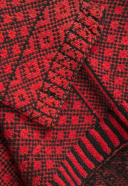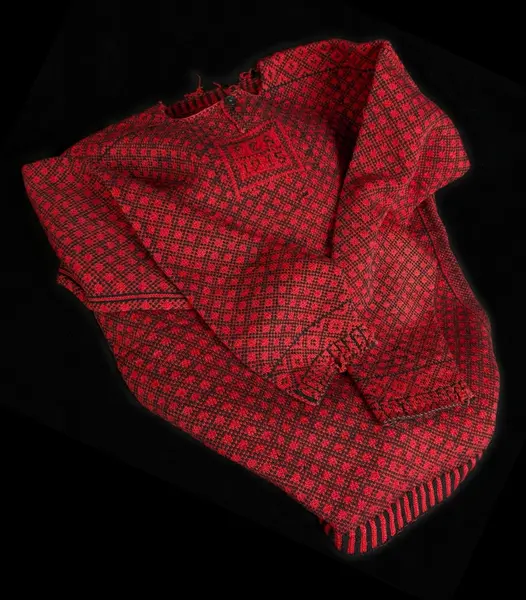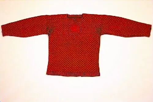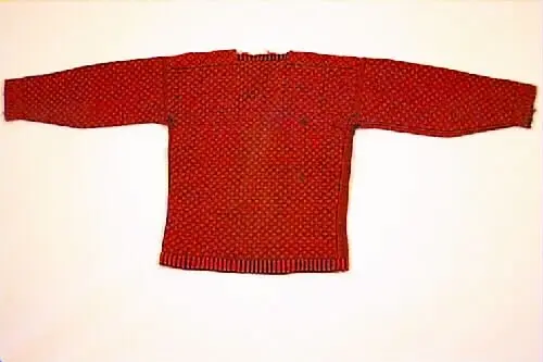- Gåva 1988 av Anna Olsson, Kvarngränd 3 , Varberg. Tröjan har tillhört givarens far, Fredrik Eriksson, bondson, född i "Smeas" i Bua. Detta var en normalstor gård utan fiske. Fadern blev slaktare hos "Schmidt", kreaturshandlare i Värö. Gick även runt i gårdarna och slaktade. Han var kunnig i djurvård och anlitades av bönderna. Ville bli veterinär. Bodde med sin familj, 8 barn, hos svärmodern vars man "gått Amerika". Totalt 12 personer i hushållet i torpet "Ingers". Man hade en ko, 1 hushållsgris och höns. Tröjan är, enligt uppgift, stickad av "Anders i Treared" som sysslade med hemslöjd. Givaren har ej minnen av att fadern burit tröjan.