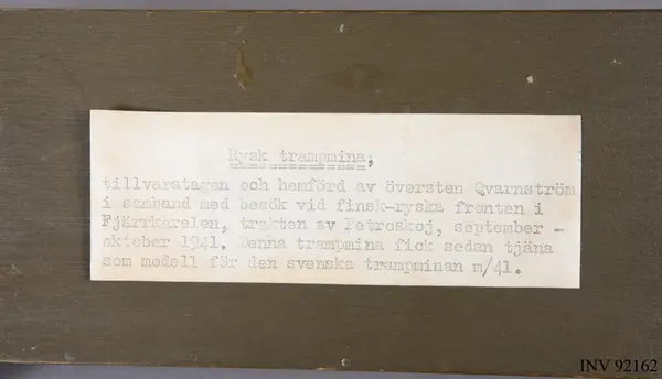 Minan hittades av överste Qvarnström i samband med besök vid finsk-ryska fronten i Fjärrkarelen i närheten av Petroskoj. Fyndet gjordes i september – oktober 1941. Högst sannolikt Axel Joseph Einar Qvarnström (1894-1983), bördig från Linköping och 1944-55 förbandschef för Svea Trängkår. Vid tillfället var han dock chef för Norrlands Trängkår i Sollefteå.