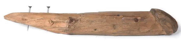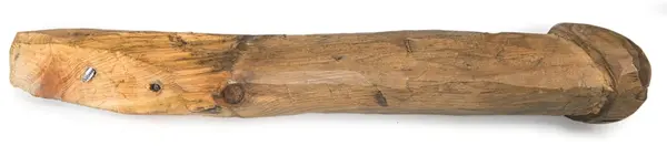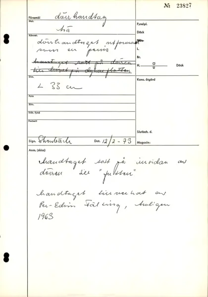 Handgjort, snidat dörrhandtag i trä. Handtaget satt på insidan av den dykarbod "futten" som var i bruk under Vasas bärgningsskede, 1956-1961 samt under de fortsatta dykundersökningarna i "Wasagropen" 1963-1967.