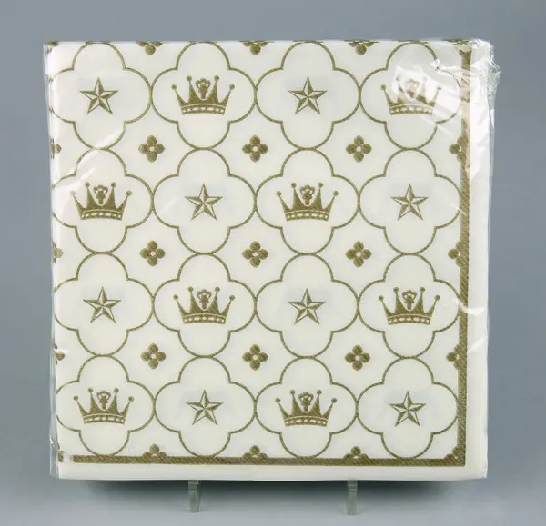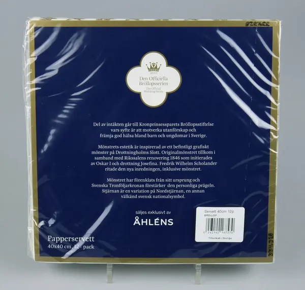 Åhléns var ett av de företag som lät tillverka och sålde saker i den officiella bröllopsserien, och dessa servetter är en av deras produkter. Just denna förpackning är inköpt på Åhléns i Fältöversten, på Östermalm i Stockholm.