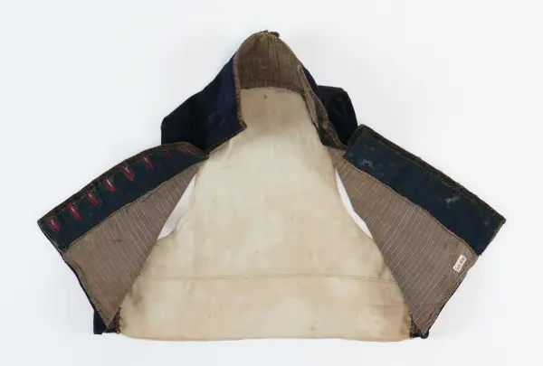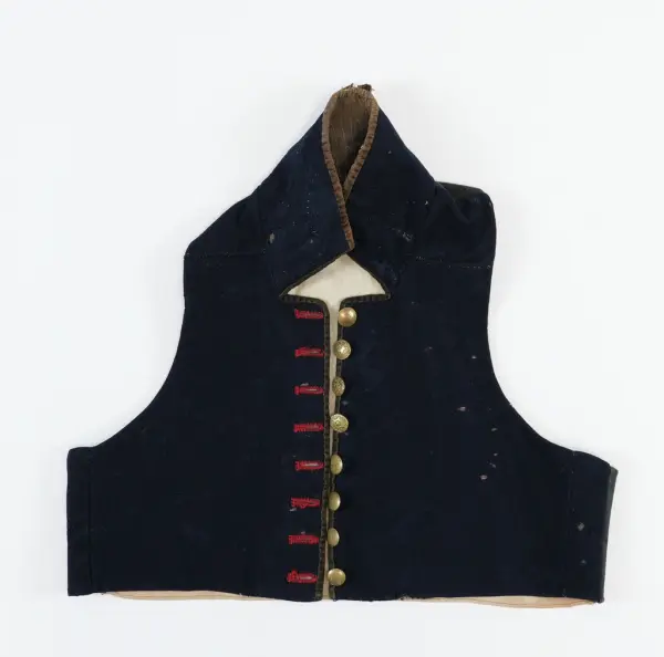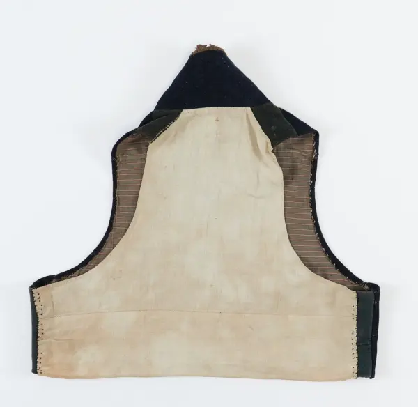 Vest sydd av mørkeblått klede med rygg av linlerret. Framstykka er fôra med stripet toskaft bomulssstoff i brunt, raudt og grått. På høgre framstykke åtte knapphol sydde med raud kameltråd, på venstre åtte runde metallknappar med pålodda hemper. Knappane er støypte skillingsknappar, nokre graverte. Slitne. Høg ståkrage stukken m... Vest sydd av mørkeblått klede med rygg av linlerret. Framstykka er fôra med stripet toskaft bomulssstoff i brunt, raudt og grått. På høgre framstykke åtte knapphol sydde med raud kameltråd, på venstre åtte runde metallknappar med pålodda hemper. Knappane er støypte skillingsknappar, nokre graverte. Slitne. Høg ståkrage stukken med prikkesting av ubleika lingarn. Krage og opning kanta med brune (svarte?) flyelsband. Fôr bak knapper av blått ribbet ullstoff.
