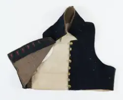 Vest sydd av mørkeblått klede med rygg av linlerret. Framstykka er fôra med stripet toskaft bomulssstoff i brunt, raudt og grått. På høgre framstykke åtte knapphol sydde med raud k...