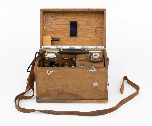 Denne felttelefonen var blant de gjenstandene som kom i Norsk Skogbruksmuseums eie ved overtakelsen av Sørlistøa i 1984-85.
