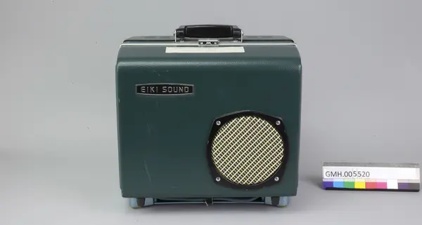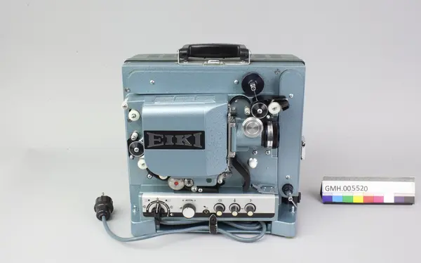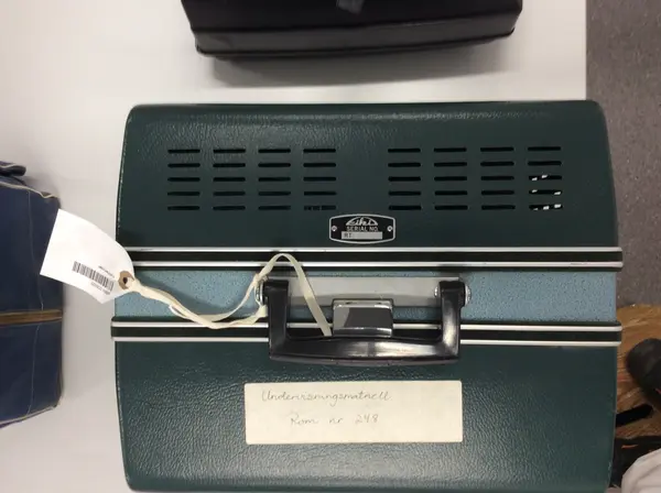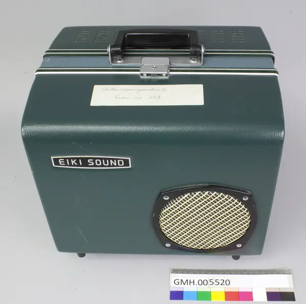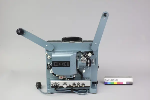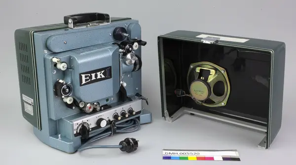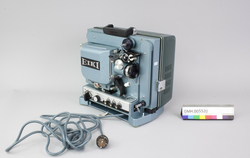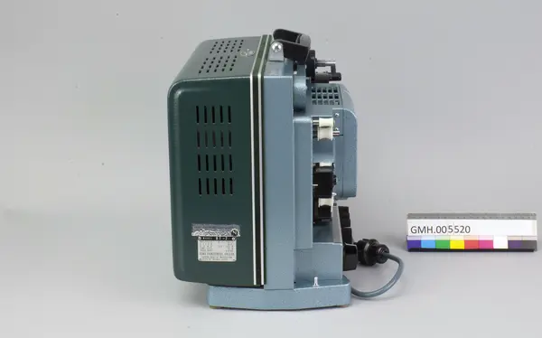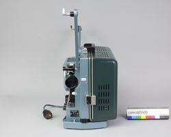 Fremviseren er funksjonsdyktig. Den har en kropp av metall og to sidedeler av grønn kunststoff. For å bruke apparatet, åpnes låsen på oversida, slik at den ene sidedelen kan tas av. I den er det innbygt et høyttaler. Den kan forbindes med apparatet med en audiokabel, som ikke ligger ved. Nederst, under projektormaskinen, er det ... Fremviseren er funksjonsdyktig. Den har en kropp av metall og to sidedeler av grønn kunststoff. For å bruke apparatet, åpnes låsen på oversida, slik at den ene sidedelen kan tas av. I den er det innbygt et høyttaler. Den kan forbindes med apparatet med en audiokabel, som ikke ligger ved. Nederst, under projektormaskinen, er det et hulrom som huser strømkabelen. Armene for filmspolene kan klaffes ut. De klaffes inn ved å trykke på en sølvfargen knapp ved siden av.