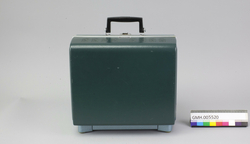 Fremviseren er funksjonsdyktig. Den har en kropp av metall og to sidedeler av grønn kunststoff. For å bruke apparatet, åpnes låsen på oversida, slik at den ene sidedelen kan tas av...