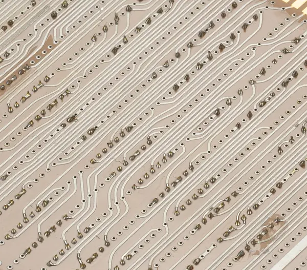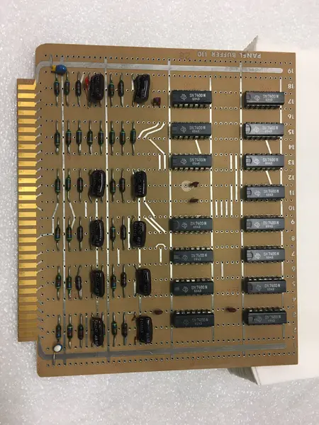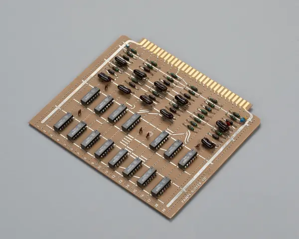 Kretskort til Nord 1-maskin fra Norsk Data. Kretskortet er påloddet 15 integrerte brikker (IC) fra Texas Instruments av typen SN7400N 6943, som er en transistor-til-transistor logisk brikke med 14 pinner, hvorav 12 gir fire NAND-porter (logisk not og and) som hver bruker to input-pinner og en output-pin. De to siste er strøm (+5 V) og jording.