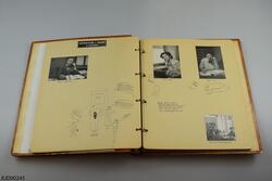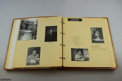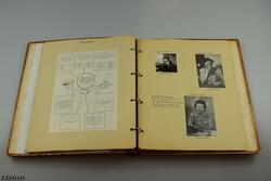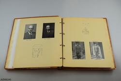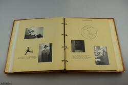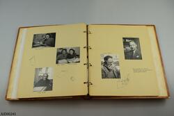 about Fotoalbum i brunt skinn med kommentarer och illustrationer. Till Gunnar Josephson den 25/7 1949 från medarbetarna i Mosaiska församlingen. Komponerat och ritat av Rut Ehnwall. Fotograferat av Hans Marosi.