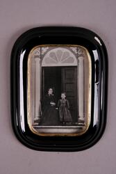 Bildet er tatt på trappen av den gamle Wessel-lårea* på Ringve. Piken ved hennes side er Johanne Cathrinne Bernhoft** – pleiedatter og brordatter – som ble gift med Richard Christopher Schjelderup Knoff.