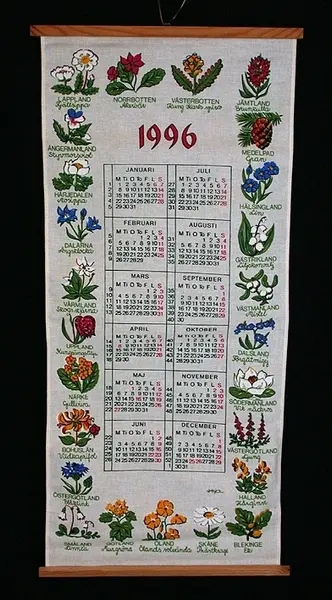 :4 Almanacka från 1996. Obehandlad trälist i över- och underkant. Vitt, fintrådigt linne med tryck i grönt, rött, gult, blått och svart. Själva almanackan omges av bilder och namn på Sveriges landskapsblommor.
