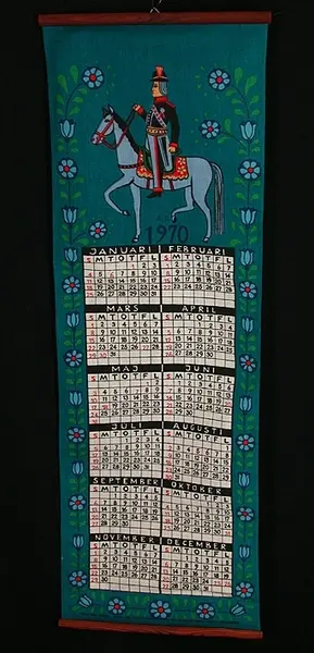 :1 Almanacka från 1970. Brunbetsad trälist i över- och underkant. Själva almanackan i vitt, svart och rött. Ram och överstycke mörkt blågrönt med en slinga av blå blommor samt ett motiv med en ryttare till häst i folkloristisk stil. Längd 900 mm, bredd 305 mm.