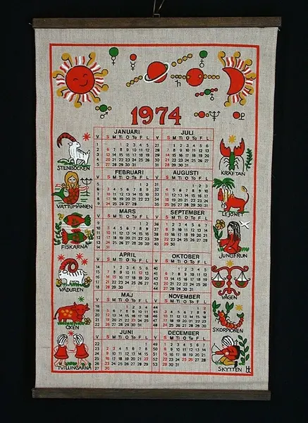 :2 Almanacka från 1974. Brunbetsad trälist i över- och underkant. Oblekt linnetyg med tryck i orange, svart, grönt, gult och vitt . Själva almanackan omges på båda sidor av stjärntecken. Överstyckets motiv består av solen, månen, planeter och stjärnbilder. Längd 525 mm, bredd 330 mm.