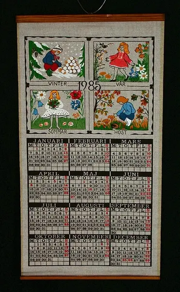 :3 Almanacka från 1985. Antikbetsad trälist i över- och underkant. Oblekt linne med tryck i brunt, rött, grönt, gult, blått och vitt. Själva almanackan utgör drygt halva längden, däröver 4 st motiv - ett för varje årstid.