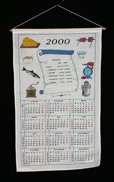 :5 Almanacka från 2000. Rund obehandlad pinne trädd i sydd kanal i tygets överkant. Vitt fintrådigt linne med tryck i blått, svart, rött, gult, grönt, brunt, rosa och grått. Själva almanackan utgör den nedre halvan av tyget. På den övre halvan avbildas en prislista med priser från år 1900 och år 2000. På båda sidor härom avbildas olika matprodukter och husgeråd.
