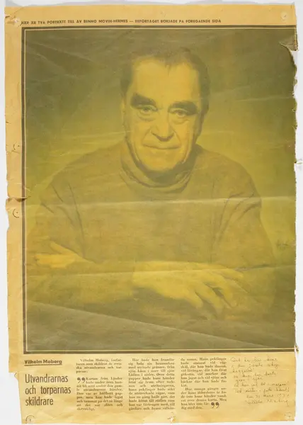 - Tidningsklippet har hängt i Vilhelm Mobergs skrivarstuga på Väddö, Norrtälje.