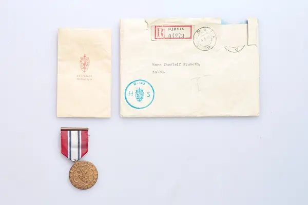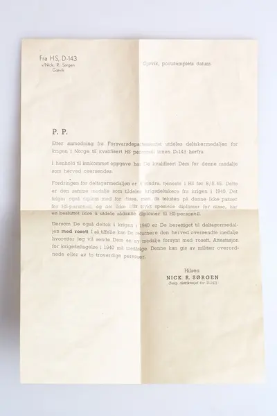 - Brev datert 4/8, 1947. Deltakermedaljen fra HS D-143 v/Nick R. Sørgen.