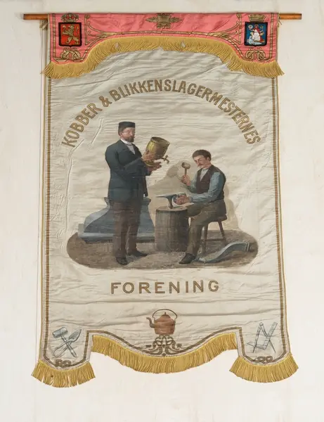 Til høyre sitter en mann på en tønne mens han bearbeider et blikkstykke på ambolt med klubbe. til venstre en mann som rekker frem et messingfarget kar med tut og hane til den andre. til venstre røykhette av blikk, til høyre avløpsrør for takrenne. Nederst til venstre blikksaks og klubbe sammenstilt, nederst til høyre vinkel og stikkpasser sammenstilt, i midten nederst kobberkjele. Bakside: skjold med diverse arbeidsredskaper sammenstilt, innrammet av laurbærkrans med sølvfargede bånd.