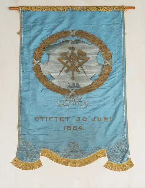 Forside: To menn i arbeidssituasjon. Skjold med arbiedsredskaper innrammet av krans.
