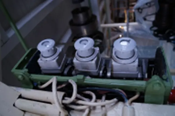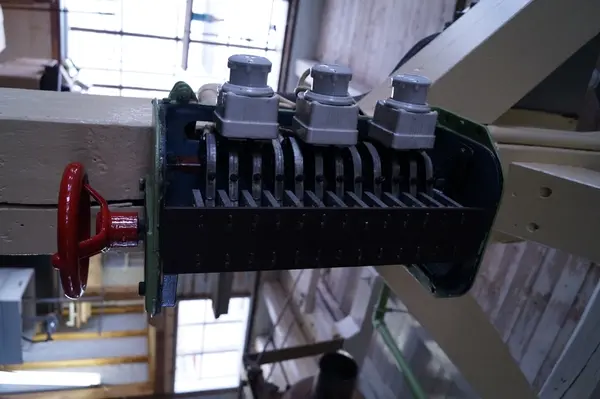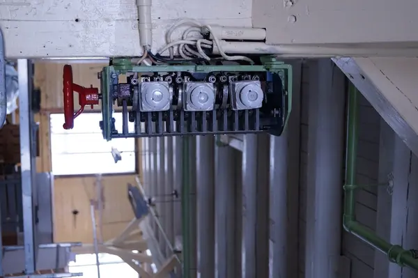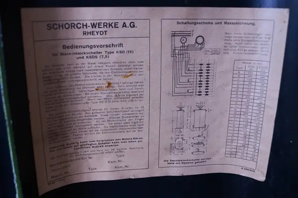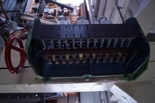- Stjernetrekantbrytar til motor, truleg brukt til spinnemaskin i 1900-bygget på Salhus Tricotagefabrik, der den framleis står fastmontert.