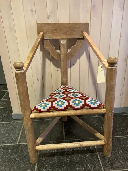 - Stolen kommer fra portnerboligene ved Odals Værk. Stolen kom til museet i flere deler. En del måtte erstattes når den ble reparert. Stoltrekket er brodert på nytt etter farger og mønster fra en bevart bit.