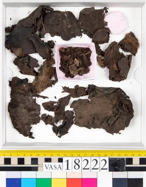 Well over 1400 shoe and boot parts have been found on Vasa. Between the end of the 16th century and the mid 17th century, three types of footwear dominated fashion. These were the latchet shoe, the boot and the pantable slipper, all of which are represented in the Vasa material. The latchet shoe was tied through two straps over the instep. The boot of the early 17th century had a closely fitted shaft of soft leather which could be turned down at the top. Slippers, also called pantables, lacked quarters and often had thicker soles of wood and cork. Some shoes were still made as distinct lefts and rights, although from ca 1580 it was increasingly common to make shoes on an “upright” or straight last, and the shoes would become matched to the left and right foot through wear. Elevated heels first gained popularity throughout western Europe in the late 16th century; before then shoes were flat soled. Both flat soles and elevated heels are seen in the Vasa shoes. Leather of various types could be used for any part of the shoe, but some shoes include birchbark midsole layers for insulation or waterproofing, and pantables often had wood and cork in the sole.