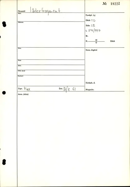 På grund av fragmenteringsgraden har ej lädret mätts.