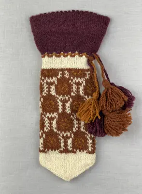 En stickad mössa, i mönsterstickad slätstickning, av 2-trådigt ullgarn. Mössan är rundstickad och har en fåll med picoter i nederkant, som är fastsydd med kaststygn. Toppen på möss...