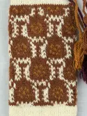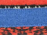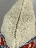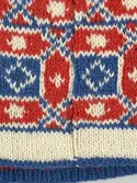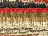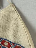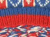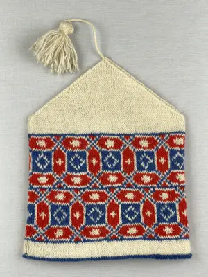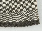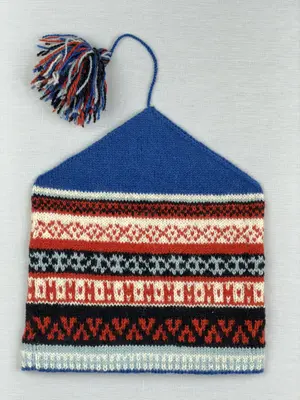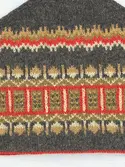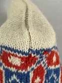 En stickad mössa, i mönsterstickad slätstickning, av 2-trådigt ullgarn. Mössan är rundstickad och har en fåll, med ett uddvarv vid fållvikning i nederkant, som är fastsydd med kast...