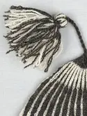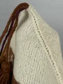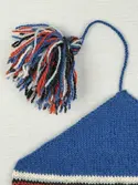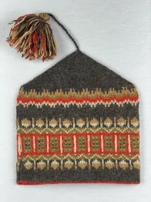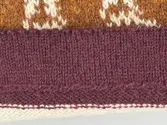 En stickad mössa, i mönsterstickad slätstickning, av 2-trådigt ullgarn. Mössan är rundstickad, men har en avig maska på två sidor, som dekor och ska likna en söm. Nederkantens fåll...