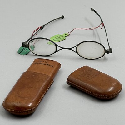 Glasögon. Ovala, negativa sfäriska glas. Bågar av vitmetall. Skalmarna med led böjliga i vertikal riktning. Skalmarnas bakre ändar med öglor. Fodral av brunt läder. Stämpel i lädre...